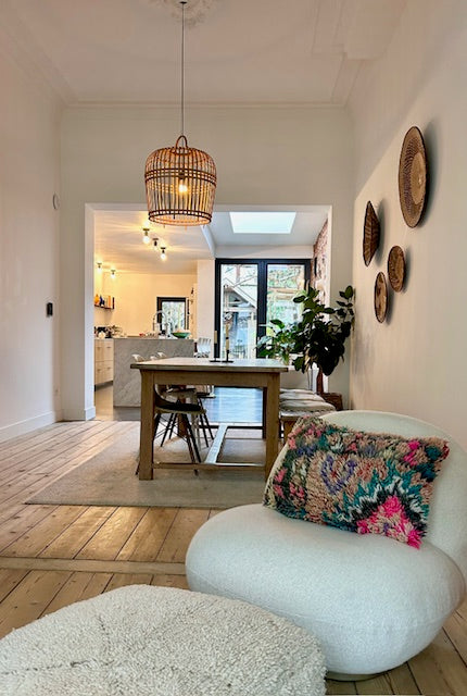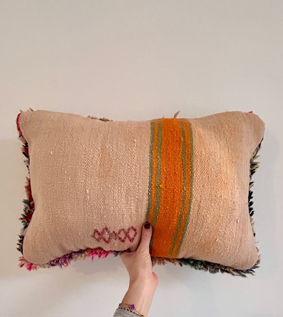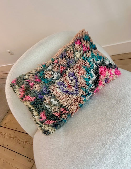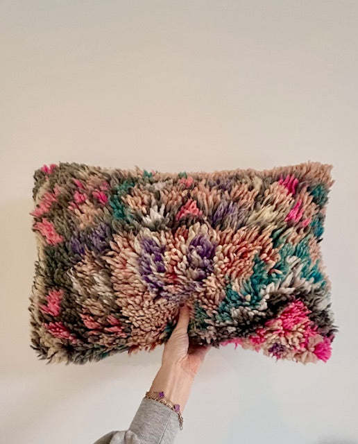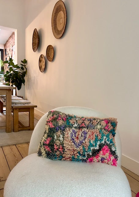 Een prachtig wollen kussen voor een boho sfeertje in huis. Dit Marokkaans kussen is met de hand vervaardigd door vrouwen uit het Atlasgebergte. Ze is uit een vintage tapijt gemaakt en de achterkant heeft een mooie kelim stof. Elk stuk is one-of-a-kind en wordt zelf geselecteerd door Little Nomad. Met een berber kussen van Little Nomad heb je dus een uniek en authentiek stuk in huis gehaald!