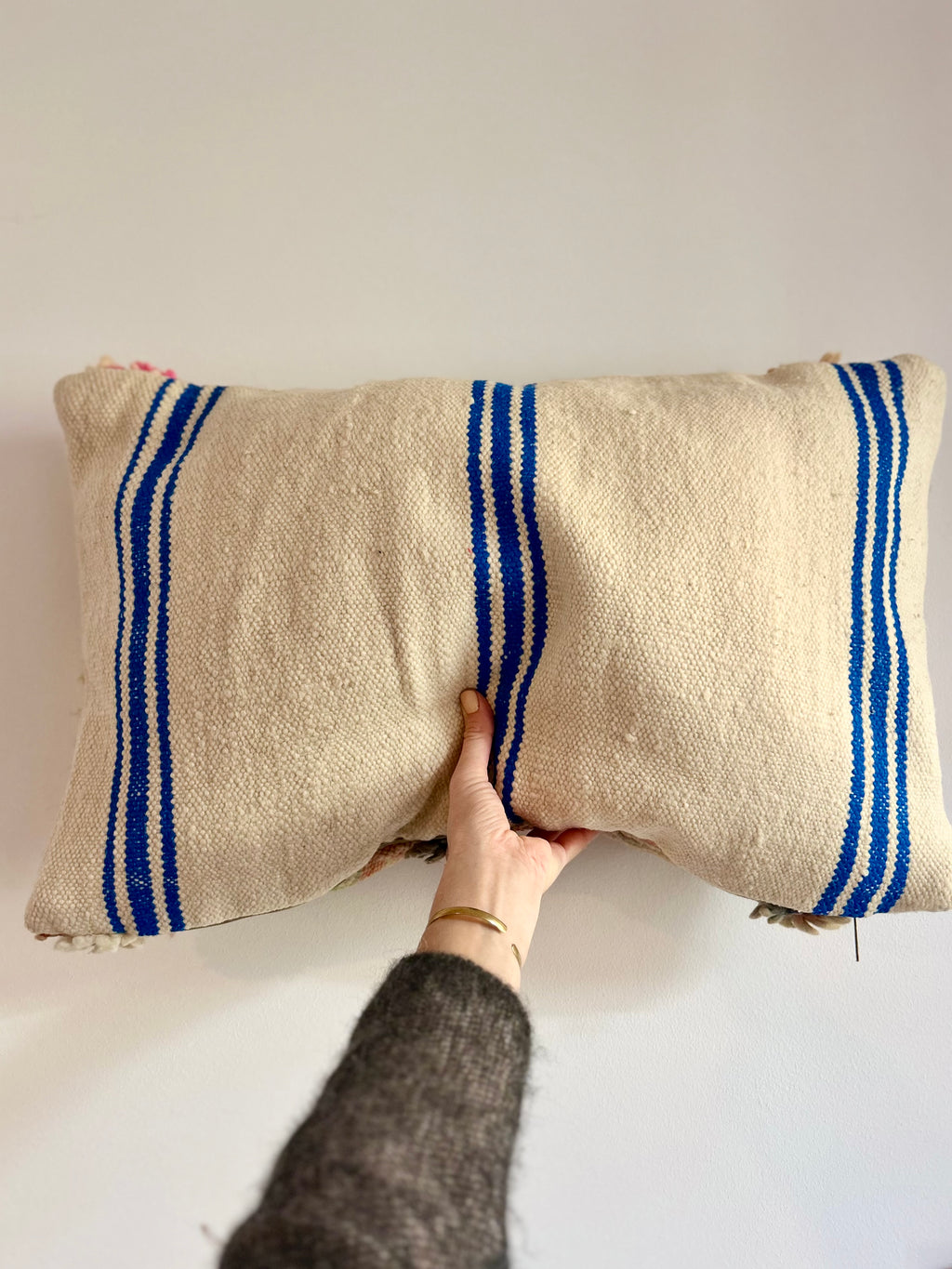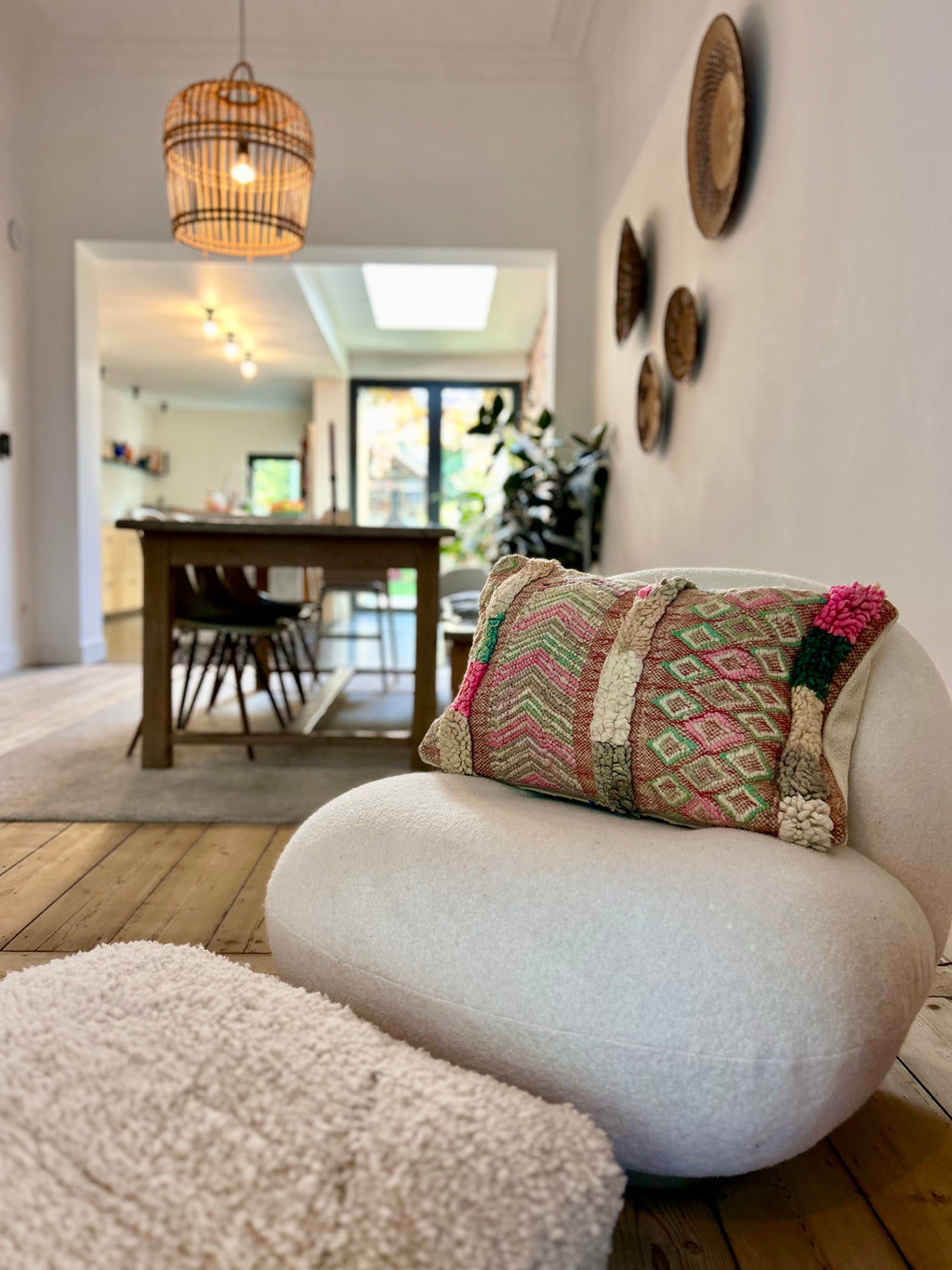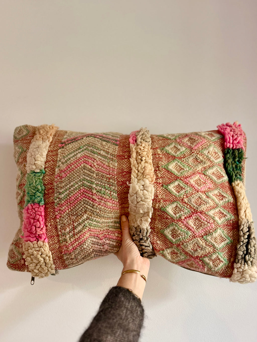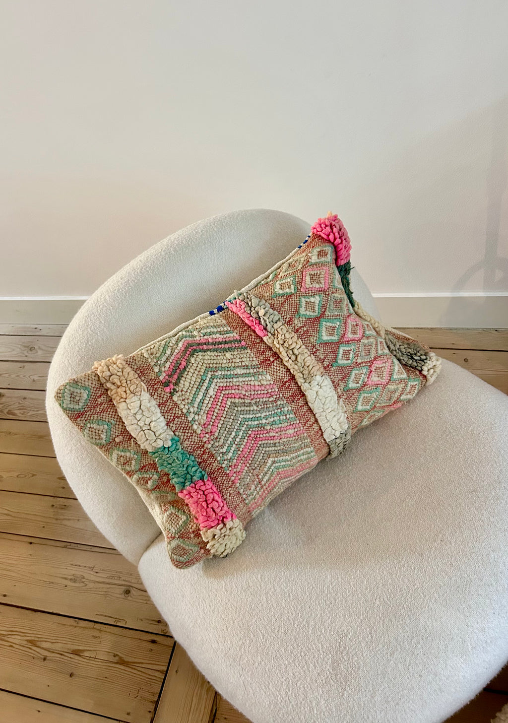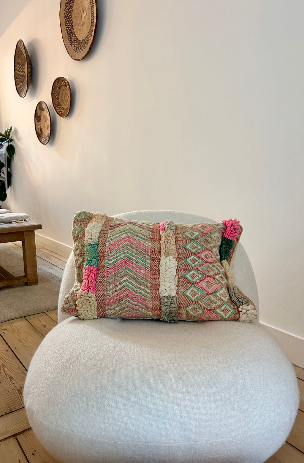 Een prachtig wollen kussen voor een boho sfeertje in huis. Dit Marokkaans kussen is met de hand vervaardigd door vrouwen uit het Atlasgebergte. Ze is uit een vintage tapijt gemaakt en de achterkant heeft een mooie kelim stof. Elk stuk is one-of-a-kind en wordt zelf geselecteerd door Little Nomad. Met een berber kussen van Little Nomad heb je dus een uniek en authentiek stuk in huis gehaald!