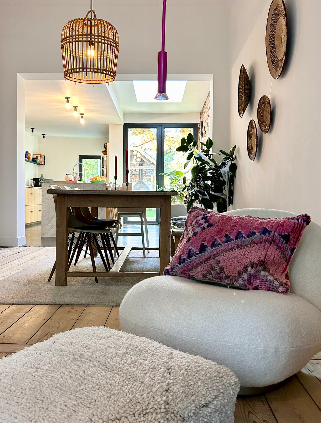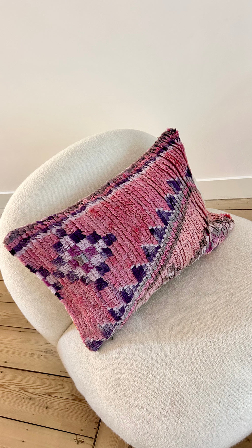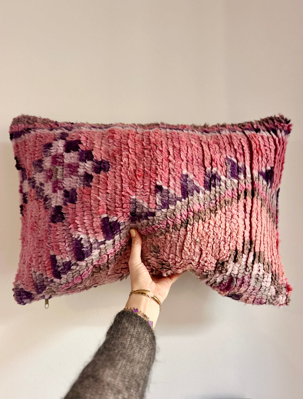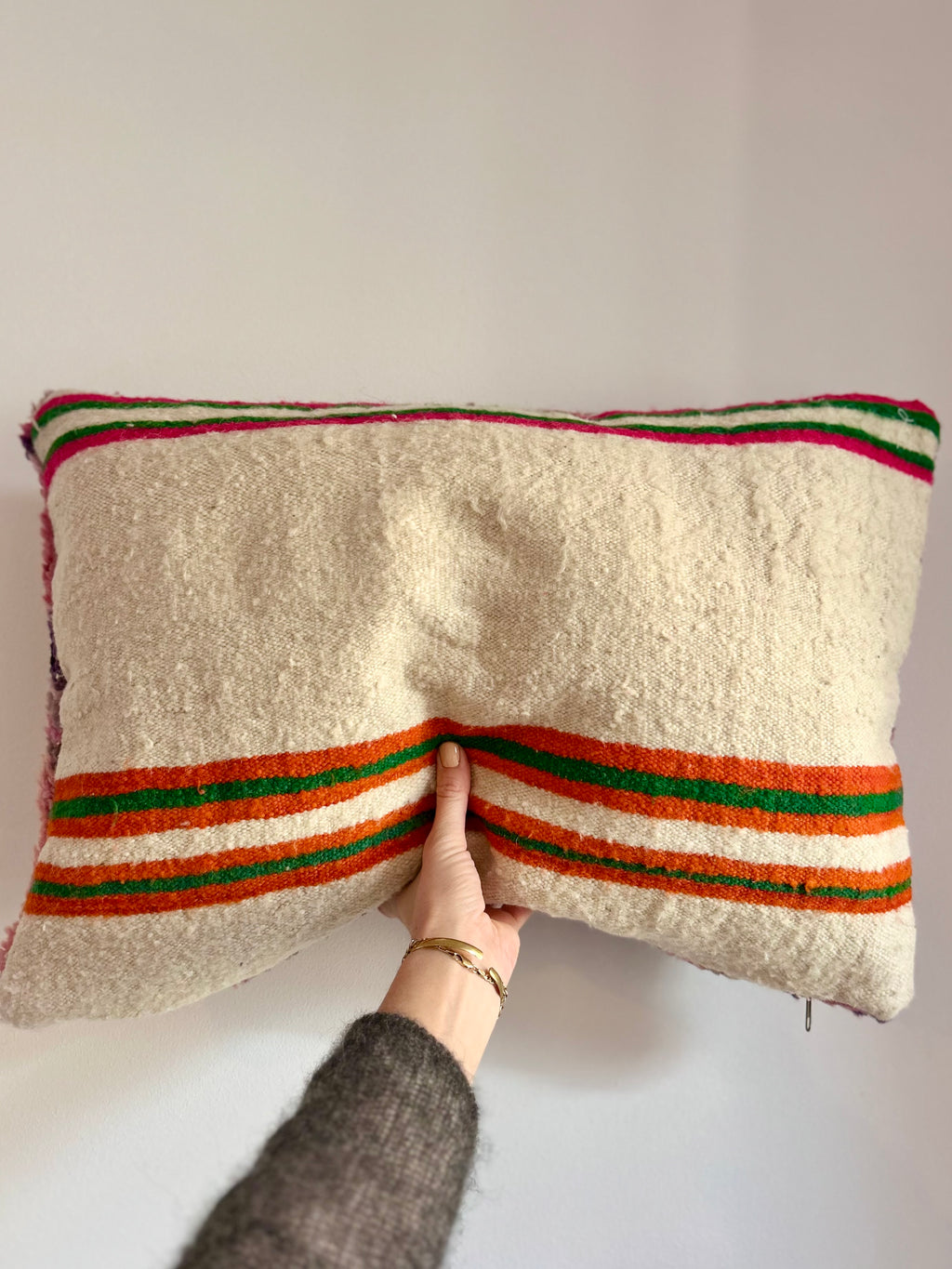 Een prachtig wollen kussen voor een boho sfeertje in huis. Dit Marokkaans kussen is met de hand vervaardigd door vrouwen uit het Atlasgebergte. Ze is uit een vintage tapijt gemaakt en de achterkant heeft een mooie kelim stof. Elk stuk is one-of-a-kind en wordt zelf geselecteerd door Little Nomad. Met een berber kussen van Little Nomad heb je dus een uniek en authentiek stuk in huis gehaald!