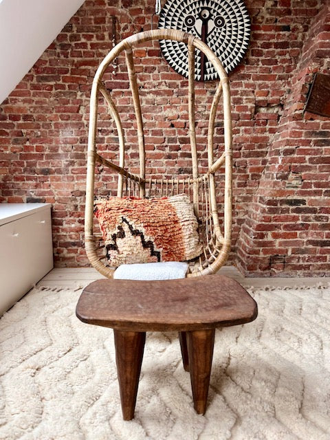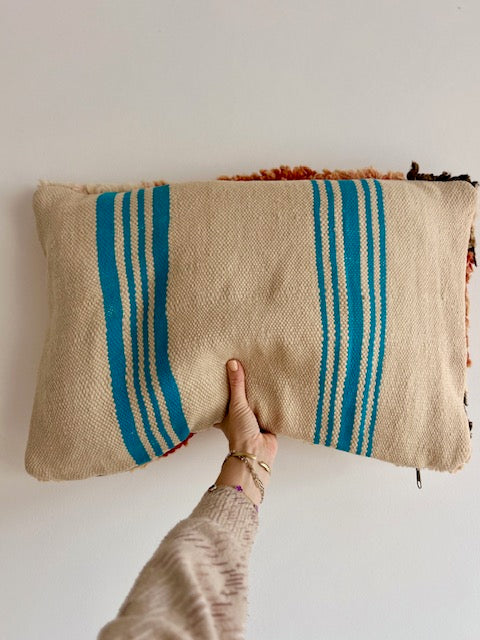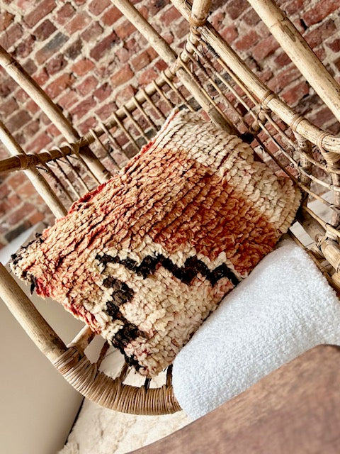 Een prachtig wollen kussen voor een boho sfeertje in huis. Dit Marokkaans kussen is met de hand vervaardigd door vrouwen uit het Atlasgebergte. Ze is uit een vintage tapijt gemaakt en de achterkant heeft een mooie kelim stof. Elk stuk is one-of-a-kind en wordt zelf geselecteerd door Little Nomad. Met een berber kussen van Little Nomad heb je dus een uniek en authentiek stuk in huis gehaald!
