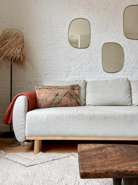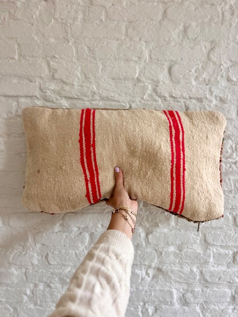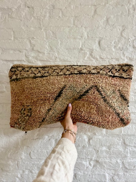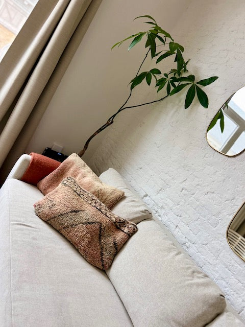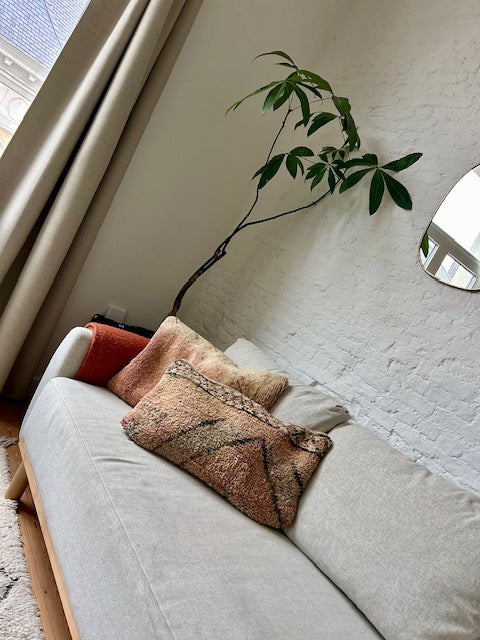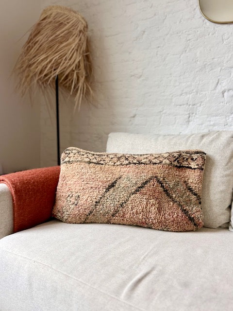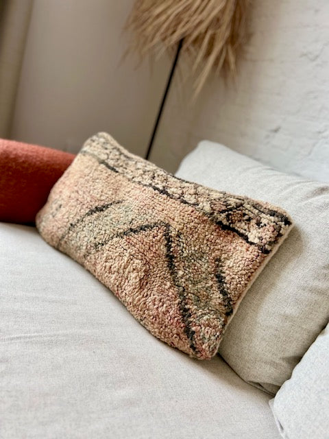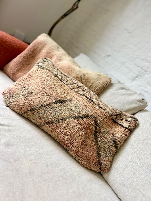 Dit Marokkaanse wollen kussen is met de hand vervaardigd door vrouwen uit het Atlasgebergte. Ze is uit een vintage tapijt gemaakt en de achterkant heeft een mooie kelim stof. Elk Marokkaans kussen is one-of-a-kind en wordt zelf geselecteerd door Little Nomad. Met een berber kussen van Little Nomad heb je dus een uniek en authentiek stuk in huis gehaald!