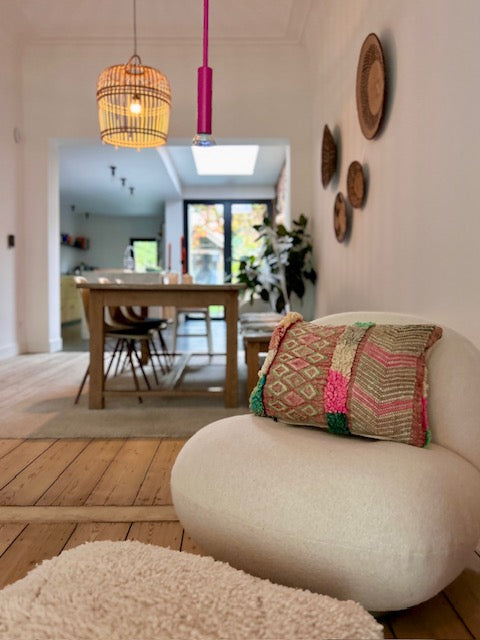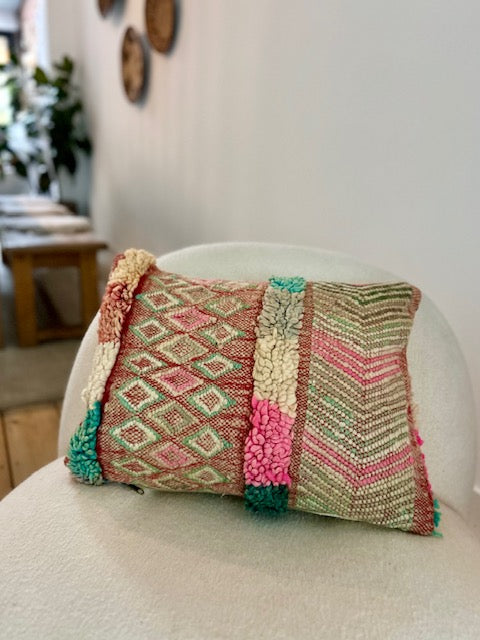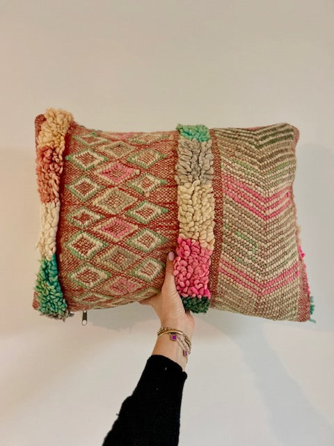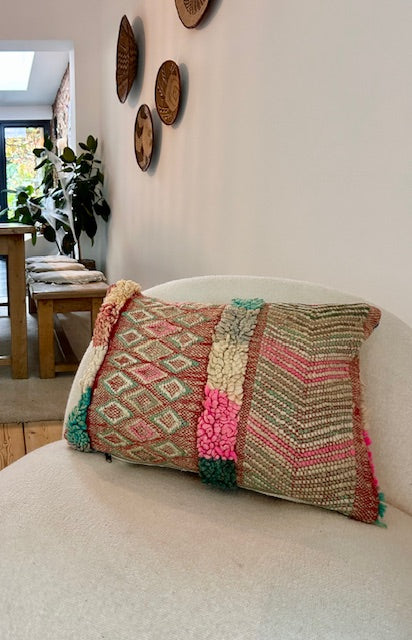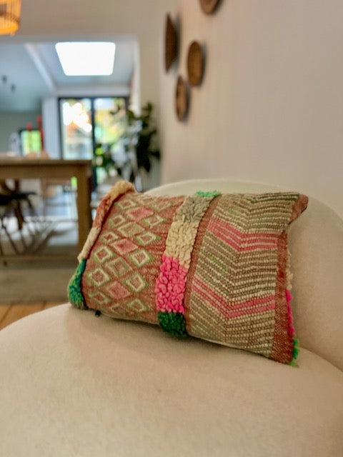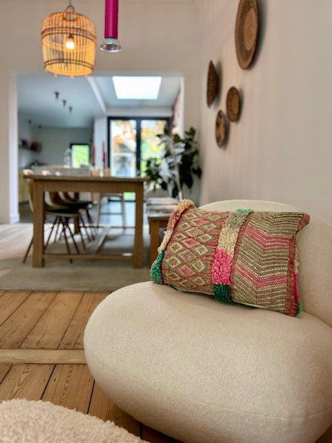 Een prachtig wollen kussen voor een boho sfeertje in huis. Dit Marokkaans kussen is met de hand vervaardigd door vrouwen uit het Atlasgebergte. Ze is uit een vintage tapijt gemaakt en de achterkant heeft een mooie kelim stof. Elk stuk is one-of-a-kind en wordt zelf geselecteerd door Little Nomad. Met een berber kussen van Little Nomad heb je dus een uniek en authentiek stuk in huis gehaald!