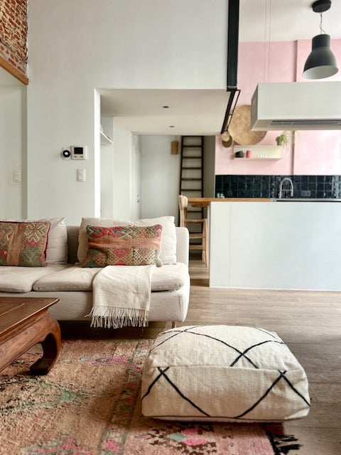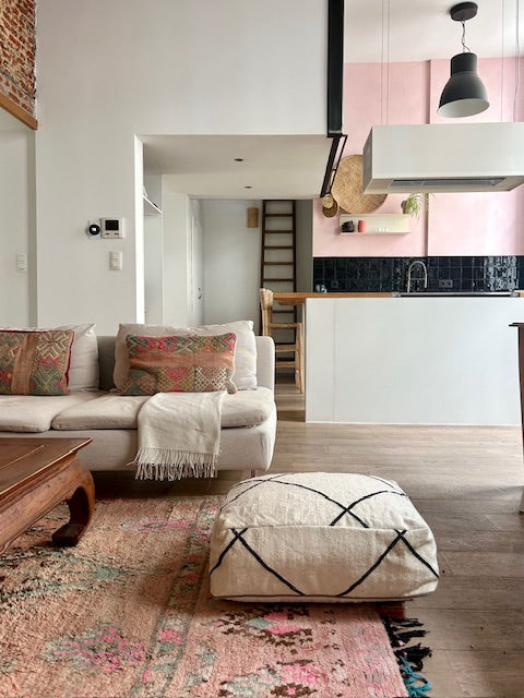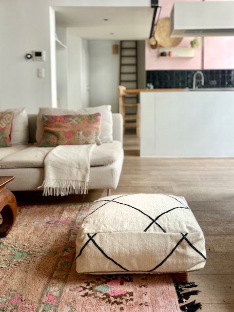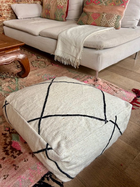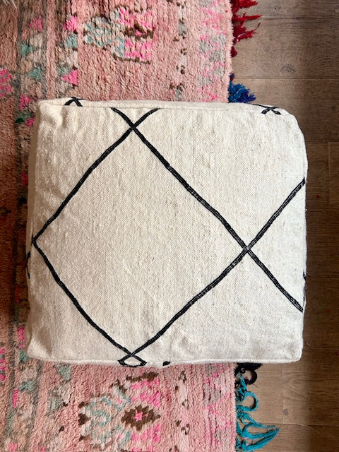Deze prachtige zitkussens worden met de hand gemaakt uit Beni Ouarain tapijten van 100% dikke schapenwol met aan de onderkant een kelim stof. Deze is gemaakt uit een flatweave tapijt, dat wil zeggen geweven zonder knopen waardoor ze er plat en gelijkmatig uitziet. Oorspronkelijk werden flatweave tapijten gebruikt in de nomadencultuur. Omdat nomaden erg veel onderweg waren, hadden zij kleden nodig die licht genoeg waren om mee te nemen.
