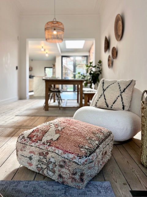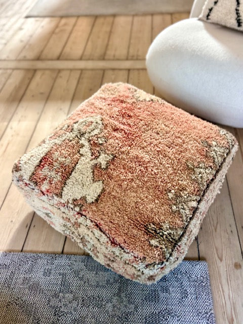 De Berber vloerkussens zijn gemaakt van vintage tapijten en ze zijn een must-have in elk interieur. Ze zijn functioneel, comfortabel en vormbaar. Dankzij de mooie bohemian look zijn ze overal in huis te plaatsen: in het salon, in een leeshoekje, in de slaapkamer en kinderkamer, op de pergola, ... Ze kunnen zelfs dienen als poef voor je viervoeter. De onderkant is gewoonlijk van kelim stof en de bovenkant van wol. Ze zijn afkomstig uit het Atlasgebergte, waar ze met de hand gemaakt worden door een grote coöperatie van vrouwen.