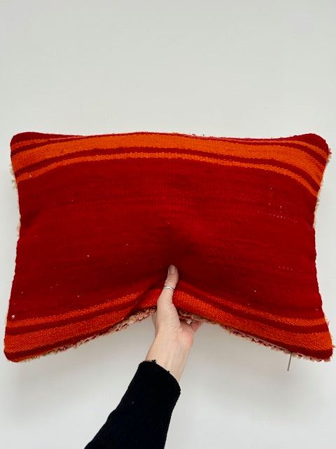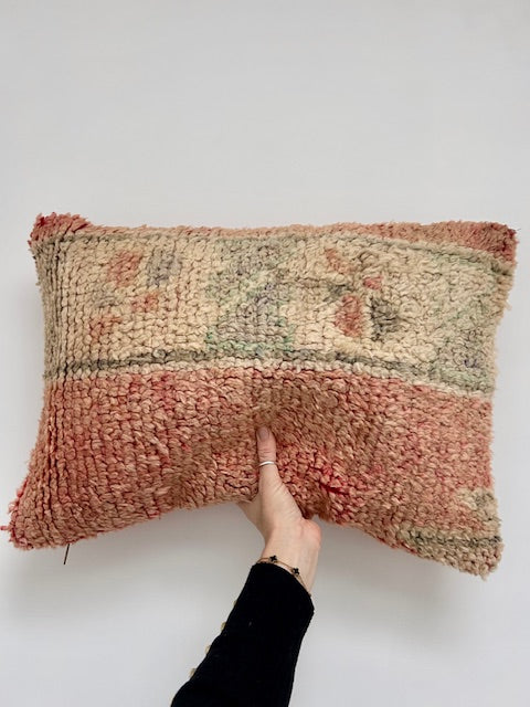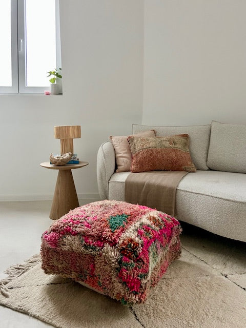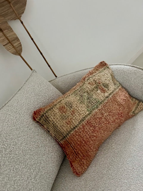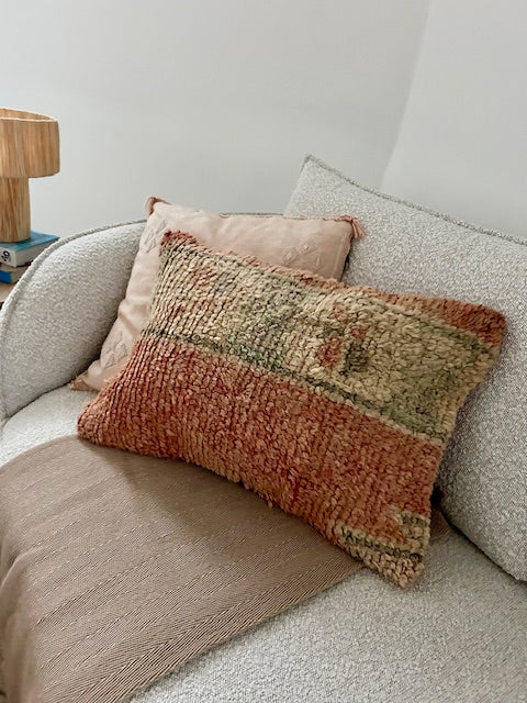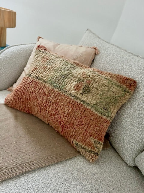 Een prachtig wollen kussen voor een boho sfeertje in huis. Dit Marokkaans kussen is met de hand vervaardigd door vrouwen uit het Atlasgebergte. Ze is uit een vintage tapijt gemaakt en de achterkant heeft een mooie kelim stof. Elk stuk is one-of-a-kind en wordt zelf geselecteerd door Little Nomad. Met een berber kussen van Little Nomad heb je dus een uniek en authentiek stuk in huis gehaald!