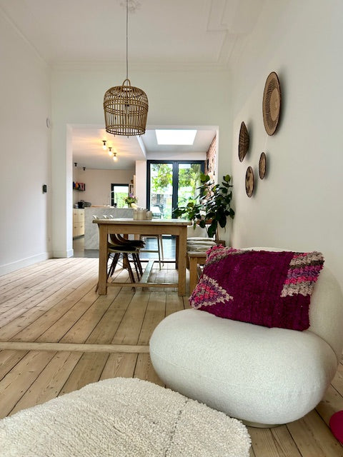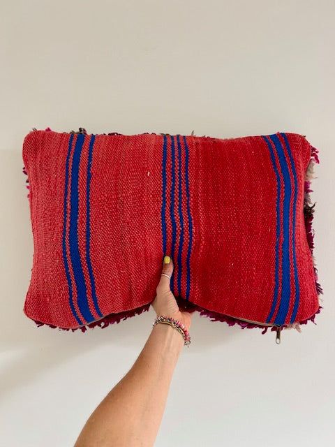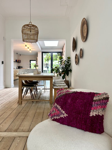 Een prachtig wollen kussen voor een boho sfeertje in huis. Dit Marokkaans kussen is met de hand vervaardigd door vrouwen uit het Atlasgebergte. Ze is uit een vintage tapijt gemaakt en de achterkant heeft een mooie kelim stof. Elk stuk is one-of-a-kind en wordt zelf geselecteerd door Little Nomad. Met een berber kussen van Little Nomad heb je dus een uniek en authentiek stuk in huis gehaald!