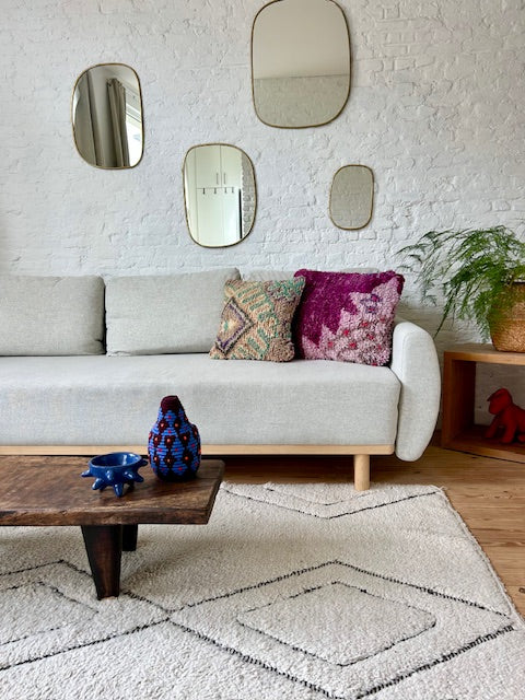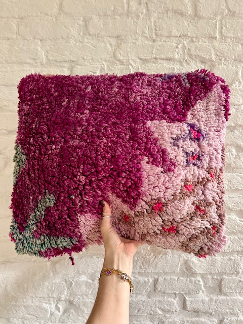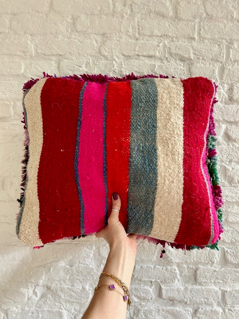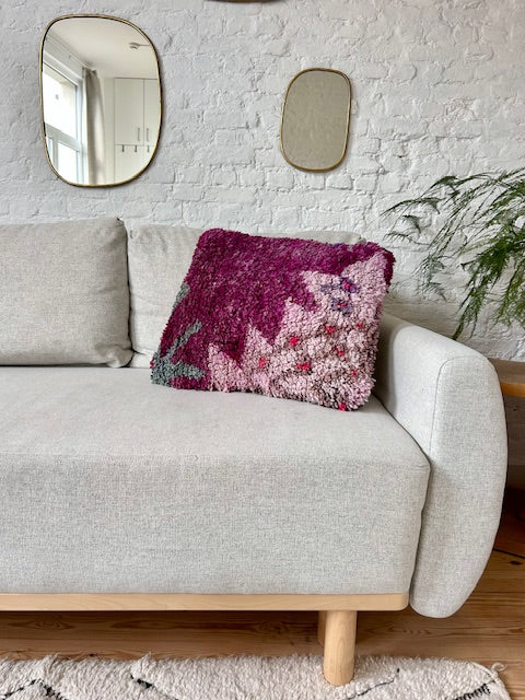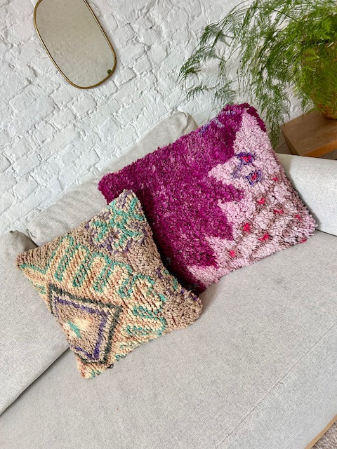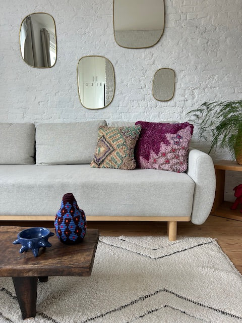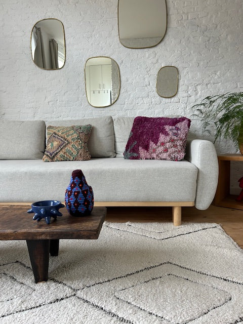 Een prachtig wollen kussen voor een boho sfeertje in huis. Dit Marokkaans kussen is met de hand vervaardigd door vrouwen uit het Atlasgebergte. Ze is uit een vintage tapijt gemaakt en de achterkant heeft een mooie kelim stof. Elk stuk is one-of-a-kind en wordt zelf geselecteerd door Little Nomad. Met een berber kussen van Little Nomad heb je dus een uniek en authentiek stuk in huis gehaald!