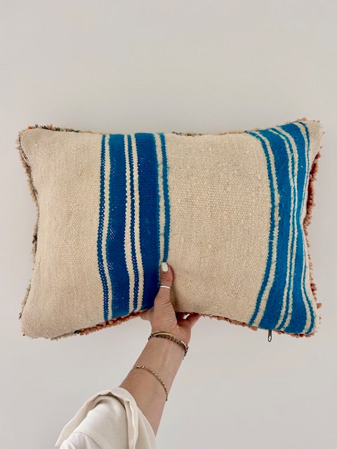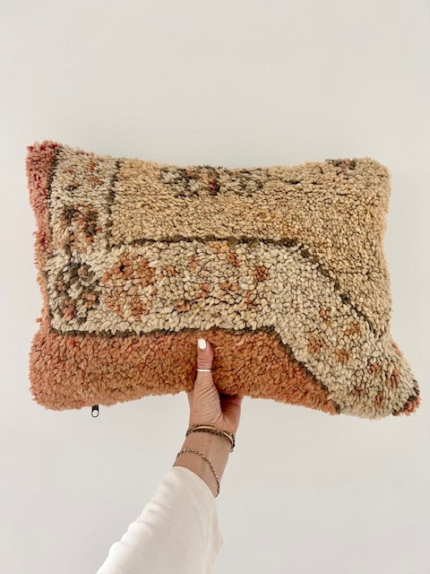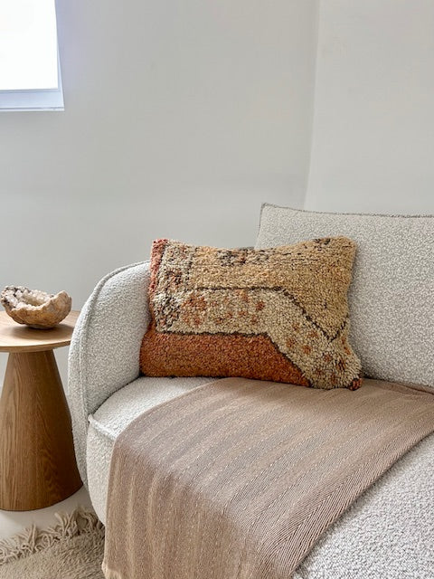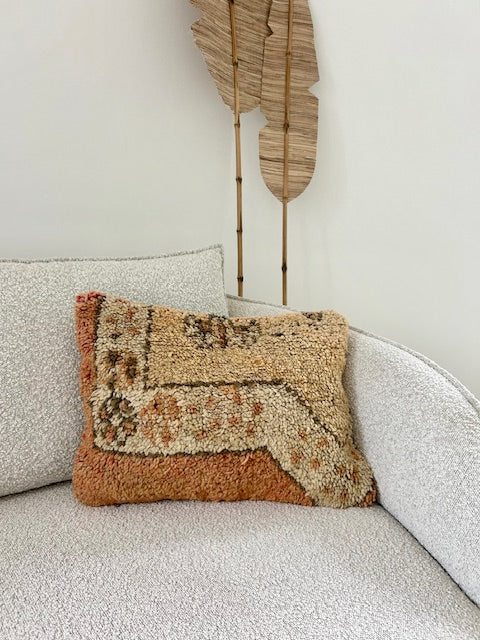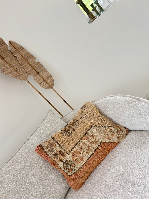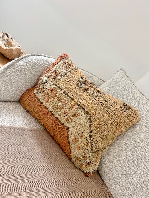 Een prachtig wollen kussen voor een boho sfeertje in huis. Dit Marokkaans kussen is met de hand vervaardigd door vrouwen uit het Atlasgebergte. Ze is uit een vintage tapijt gemaakt en de achterkant heeft een mooie kelim stof. Elk stuk is one-of-a-kind en wordt zelf geselecteerd door Little Nomad. Met een berber kussen van Little Nomad heb je dus een uniek en authentiek stuk in huis gehaald!