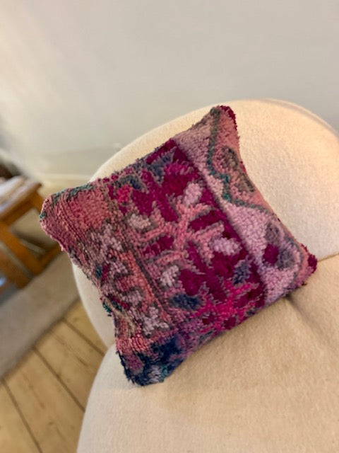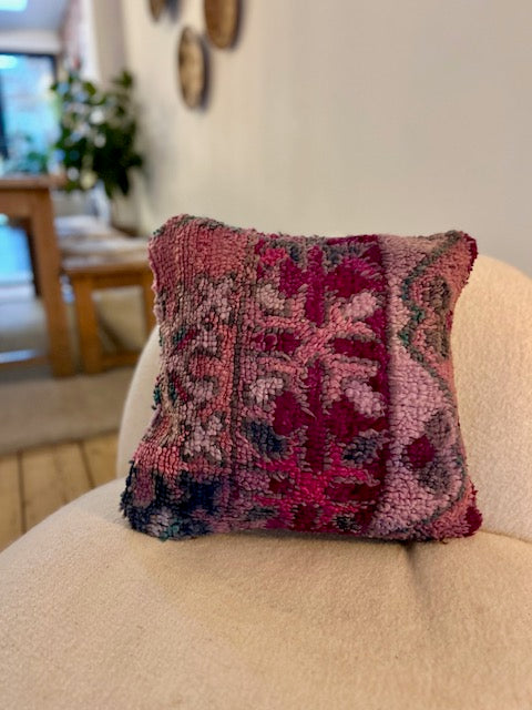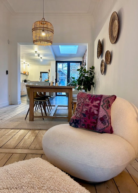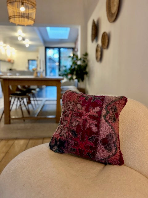 Een prachtig wollen kussen voor een boho sfeertje in huis. Dit Marokkaans kussen is met de hand vervaardigd door vrouwen uit het Atlasgebergte. Ze is uit een vintage tapijt gemaakt en de achterkant heeft een mooie kelim stof. Elk stuk is one-of-a-kind en wordt zelf geselecteerd door Little Nomad. Met een berber kussen van Little Nomad heb je dus een uniek en authentiek stuk in huis gehaald!