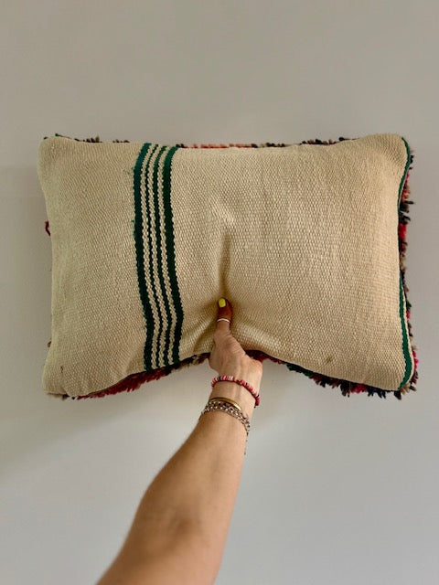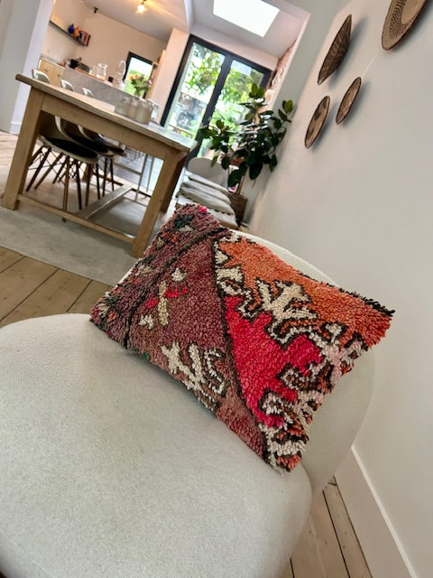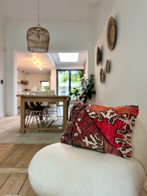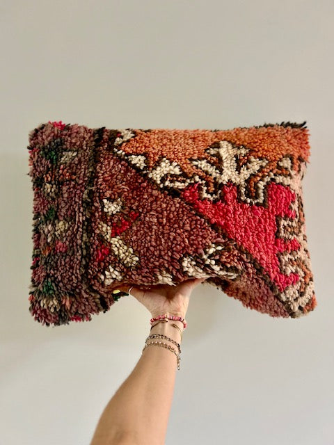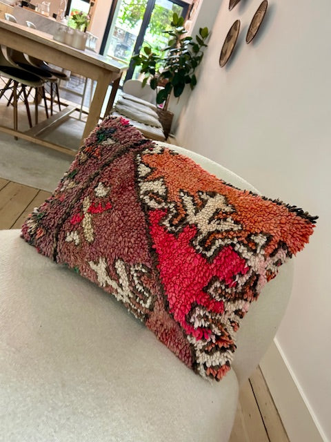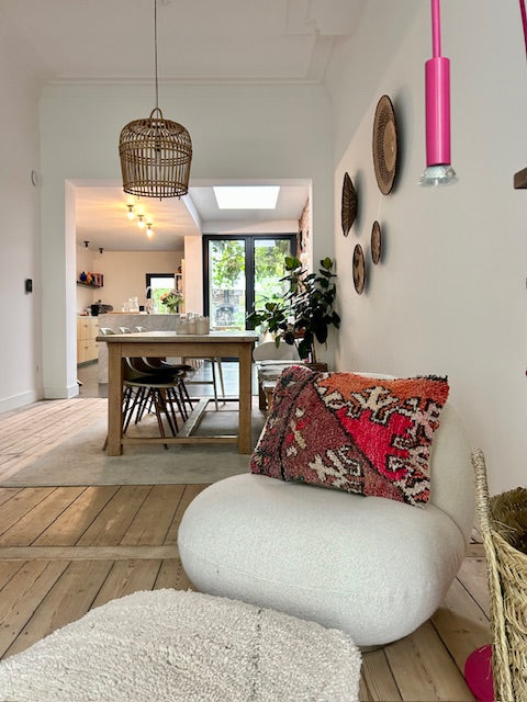 Deze prachtige wollen kussens worden met de hand vervaardigd door vrouwen uit één van de grootste coöperaties uit het Atlasgebergte in Marokko. Ze worden uit vintage Berber tapijten gemaakt en de achterkant van elk kussen heeft een mooie kelim stof. Elk stuk is one-of-a-kind en wordt zelf geselecteerd door Little Nomad. Met een berber kussen van Little Nomad heb je dus een uniek en authentiek stuk in huis gehaald!