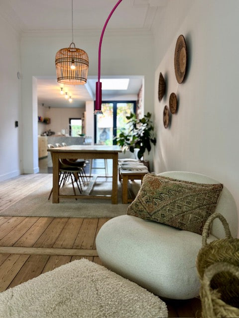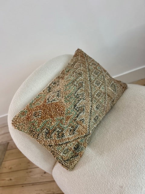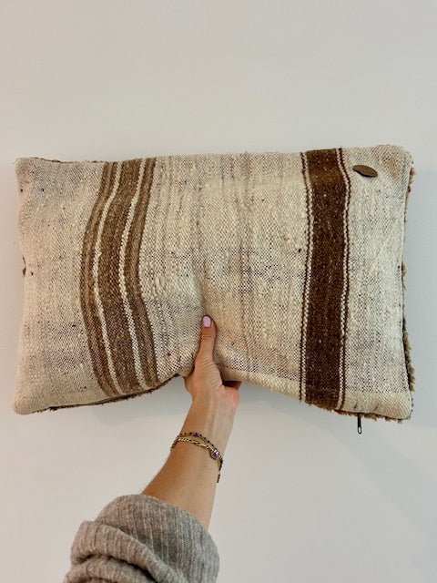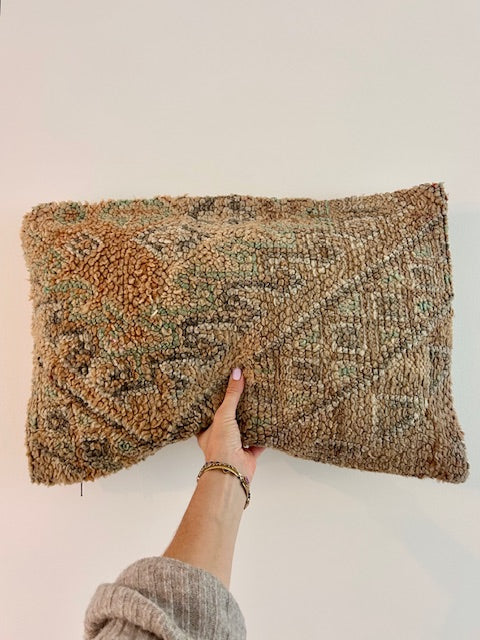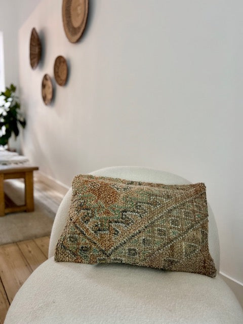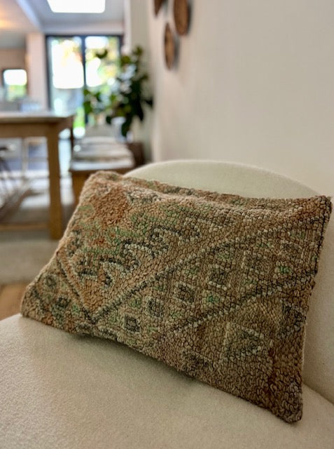 Deze prachtige schapenwollen kussens worden met de hand vervaardigd door vrouwen uit het Atlasgebergte in Marokko. Ze worden uit vintage tapijten gemaakt en de achterkant van elk kussen heeft een mooie kelim stof. Het is een stiel die van generatie op generatie wordt doorgegeven. Met trots mag je dan ook zeggen dat jouw aankoop bijdraagt aan het in stand houden van deze mooie, traditionele ambacht!
