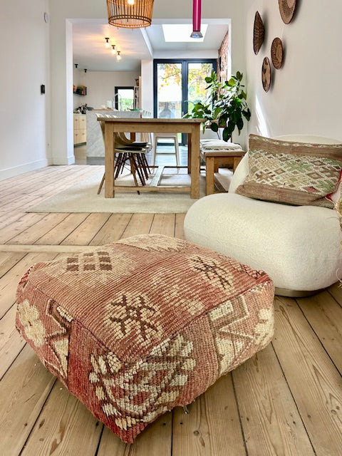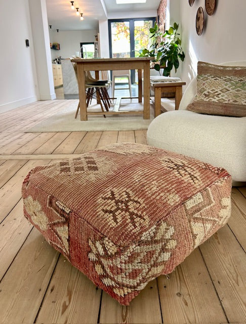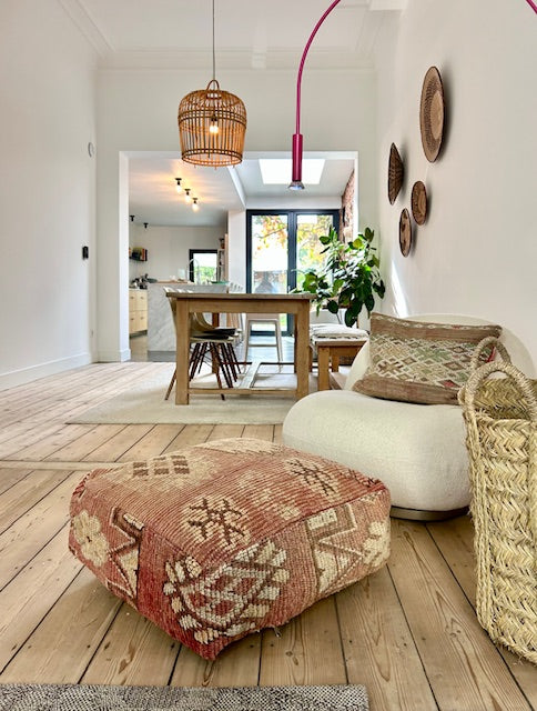 De Berber vloerkussens zijn gemaakt van vintage tapijten en ze zijn een must-have in elk interieur. Ze zijn functioneel, comfortabel en vormbaar. Dankzij de mooie bohemian look zijn ze overal in huis te plaatsen: in het salon, in een leeshoekje, in de slaapkamer en kinderkamer, op de pergola, ... Ze kunnen zelfs dienen als poef voor je viervoeter. De onderkant is gewoonlijk van kelim stof en de bovenkant van wol. Ze zijn afkomstig uit het Atlasgebergte, waar ze met de hand gemaakt worden door een grote coöperatie van vrouwen.
